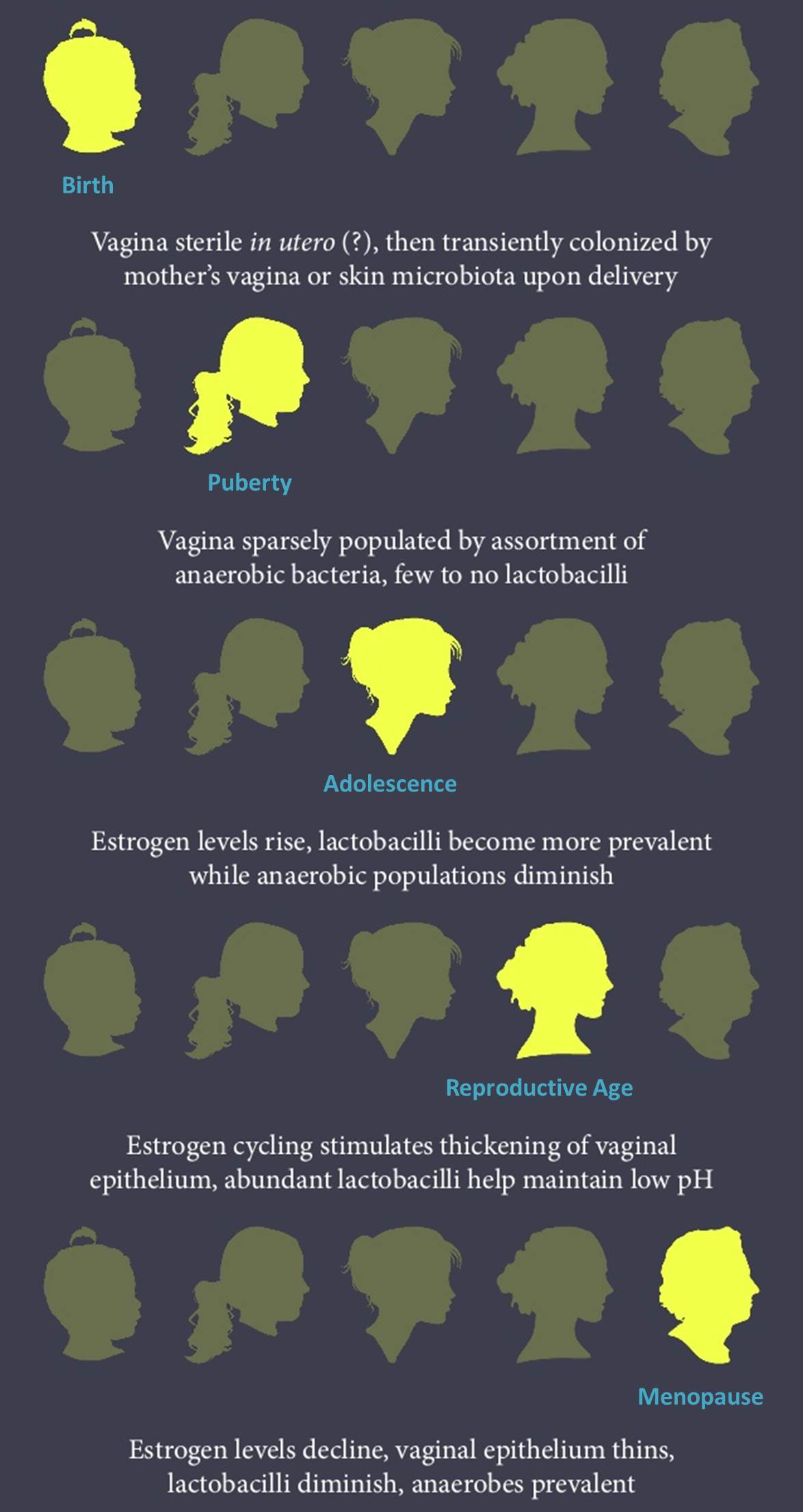 Bacteriën in de vagina spelen een cruciale rol bij de bescherming tegen infectieziekten. Het vaginale microbioom van een vrouw verandert tijdens de verschillende fases van haar leven drastisch van samenstelling (figuur 1). Deze veranderingen lijken een direct verband te hebben met haar oestrogeenniveaus [1]. Oestrogeen reguleert de verdikking van het vaginale epitheel en de productie van vaginaal glycogeen, dat wordt gebruikt door bepaalde commensale bacteriën zoals Lactobacillus-soorten [1]. Deze bacteriën zijn cruciaal voor een gezonde vagina doordat zij dit glycogeen omzetten in melkzuur, wat zorgt voor een beschermende zuurgraad (pH 3.8-4.2) [2;3]. Deze lage zuurgraad beperkt of voorkomt de groei van bepaalde pathogene organismen. Een verstoring in het vaginale microbioom kan op verschillende wijzen veroorzaakt worden. De belangrijkste zijn het gebruik van antibiotica [12], hormonale (en andere) anticonceptiemiddelen [13; 14], geslachtsgemeenschap [15], vaginale glijmiddelen [16], vaginale douche [17], menstruatie [18 - 21], zwangerschap [22] en stress [23 - 25].